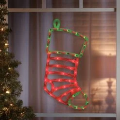 IG Design Green/Red Lit Stocking Silhouette Window Decoration 16 In.
