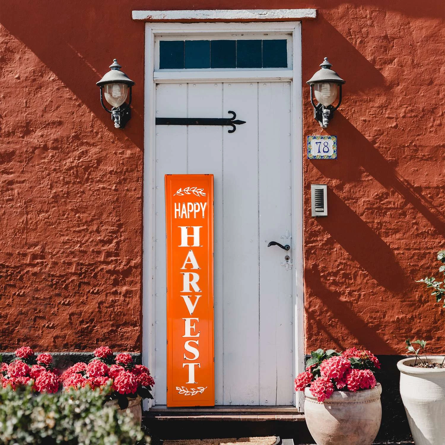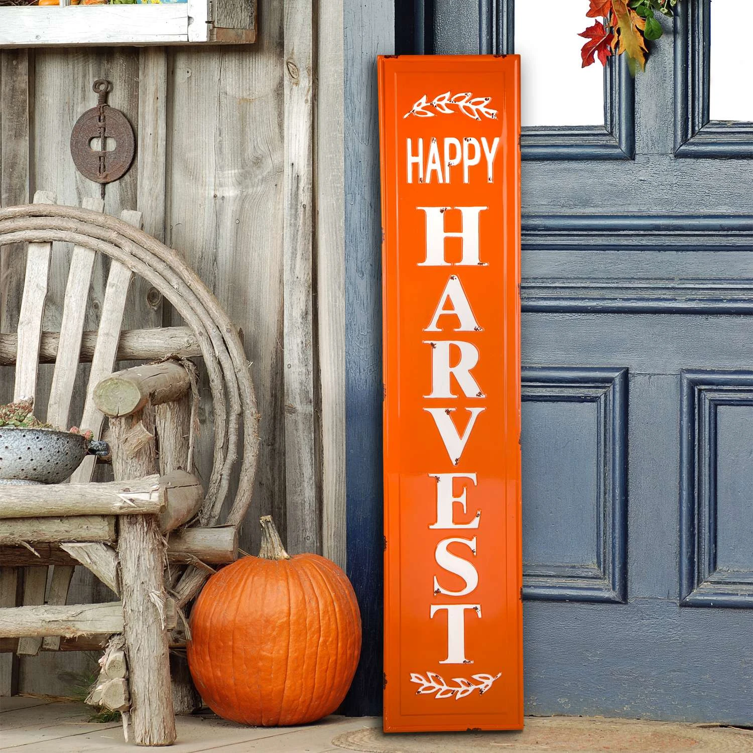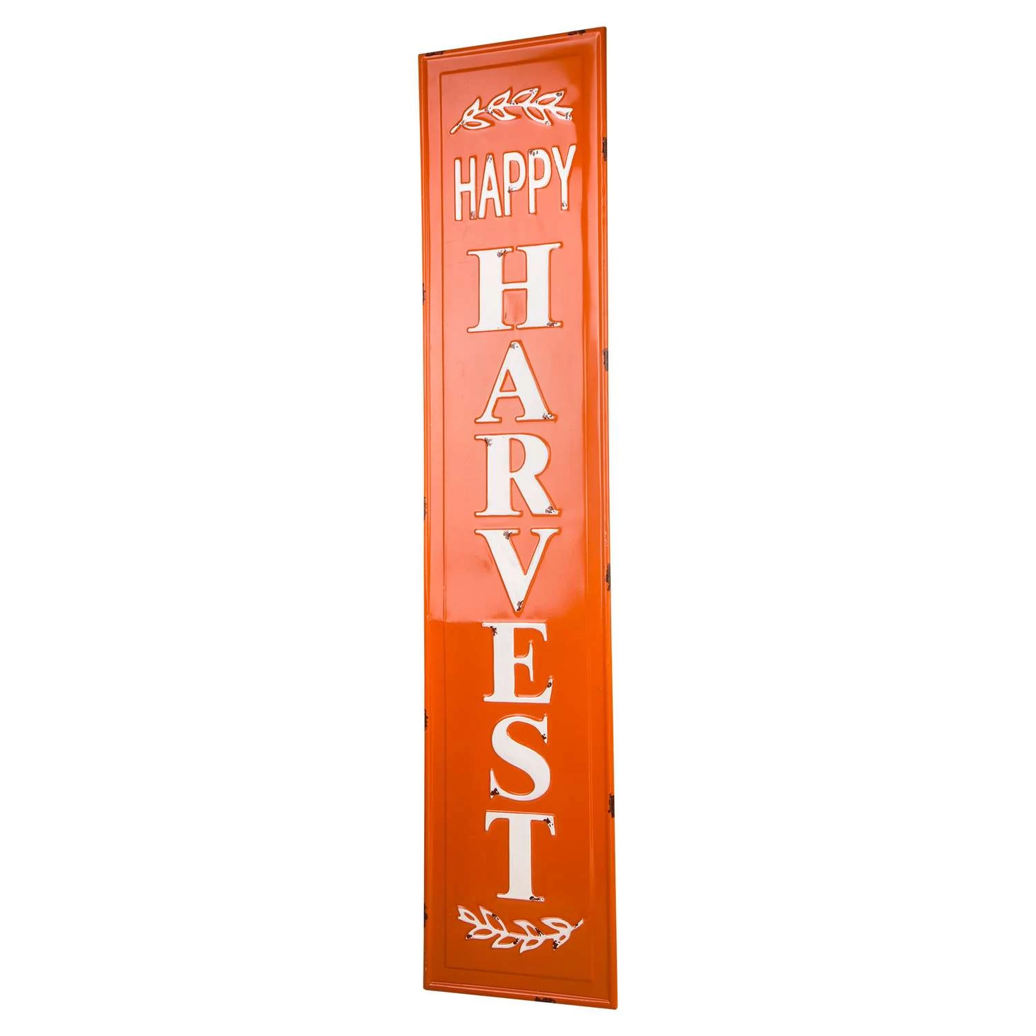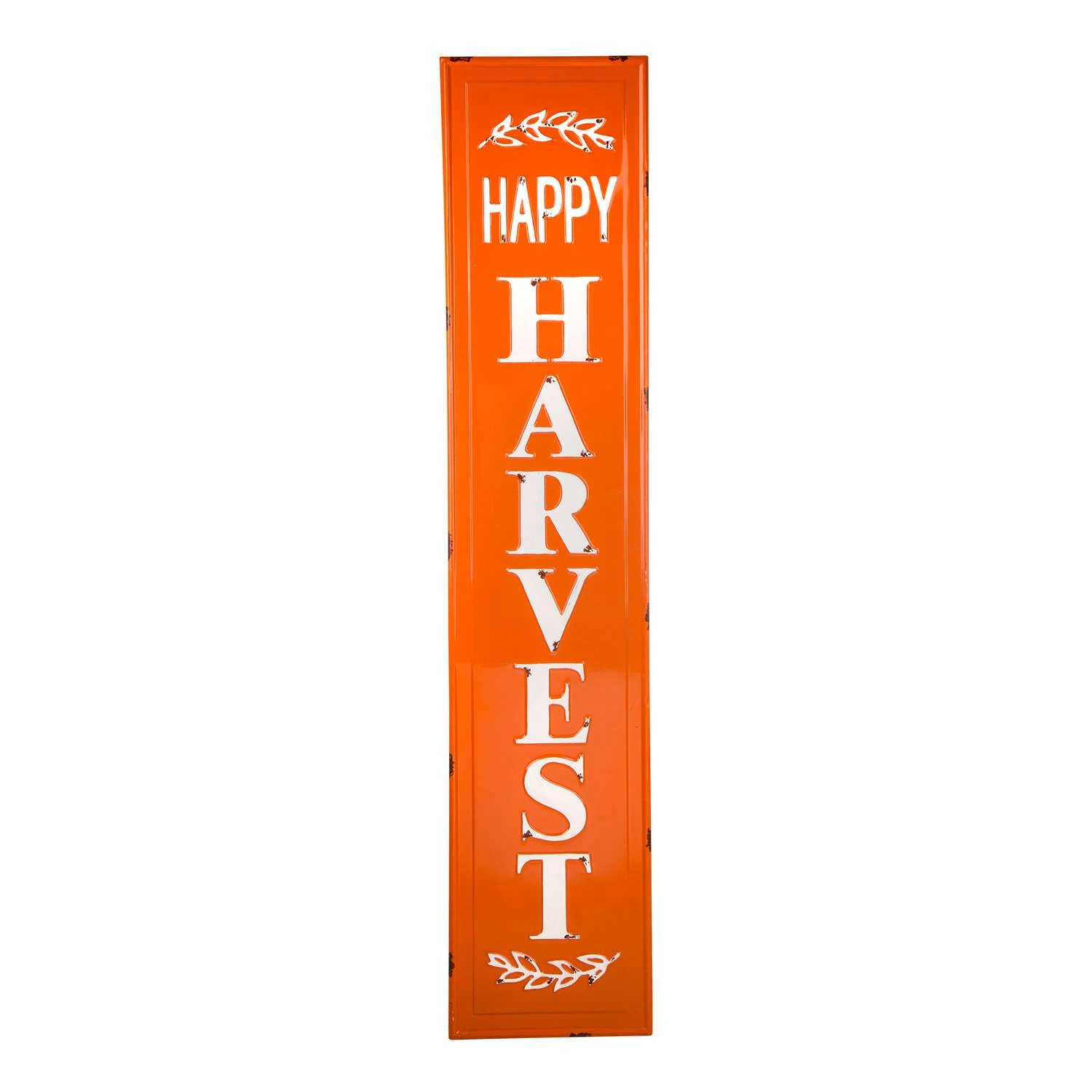 This distressing vertical porch sign features the message “happy harvest” in white on an orange metal background. This sign is made of metal, finished in distressing orange, black finish to give a festival atmosphere.HandpaintedThis sign is easily hung on the wall with gourds hangings on the back sideNo assembly required